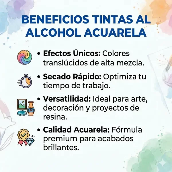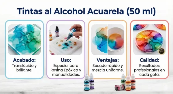Transforma tus proyectos creativos con las Tintas Al Alcohol Resina Epóxica de la marca Acuarela. Este set de 50 ml por cada color ofrece una amplia gama de tonalidades que permiten lograr efectos acuarelados impresionantes en tus obras. Su formulación especial se mezcla fácilmente con resinas epóxicas, garantizando resultados vibrantes y duraderos. Cada envase está diseñado para facilitar su uso, con un tamaño compacto que permite una manipulación sencilla. Estas tintas son ideales tanto para artistas profesionales como para aficionados que buscan experimentar con nuevas técnicas. La altura, largo y ancho del paquete aseguran que se pueda almacenar sin complicaciones en tu espacio de trabajo. Explora la versatilidad de estas tintas, perfectas para una variedad de aplicaciones, desde la creación de arte hasta proyectos de manualidades. Su efecto acuarela añade un toque único y personal a cada pieza, permitiendo que tu creatividad brille en cada trazo.
